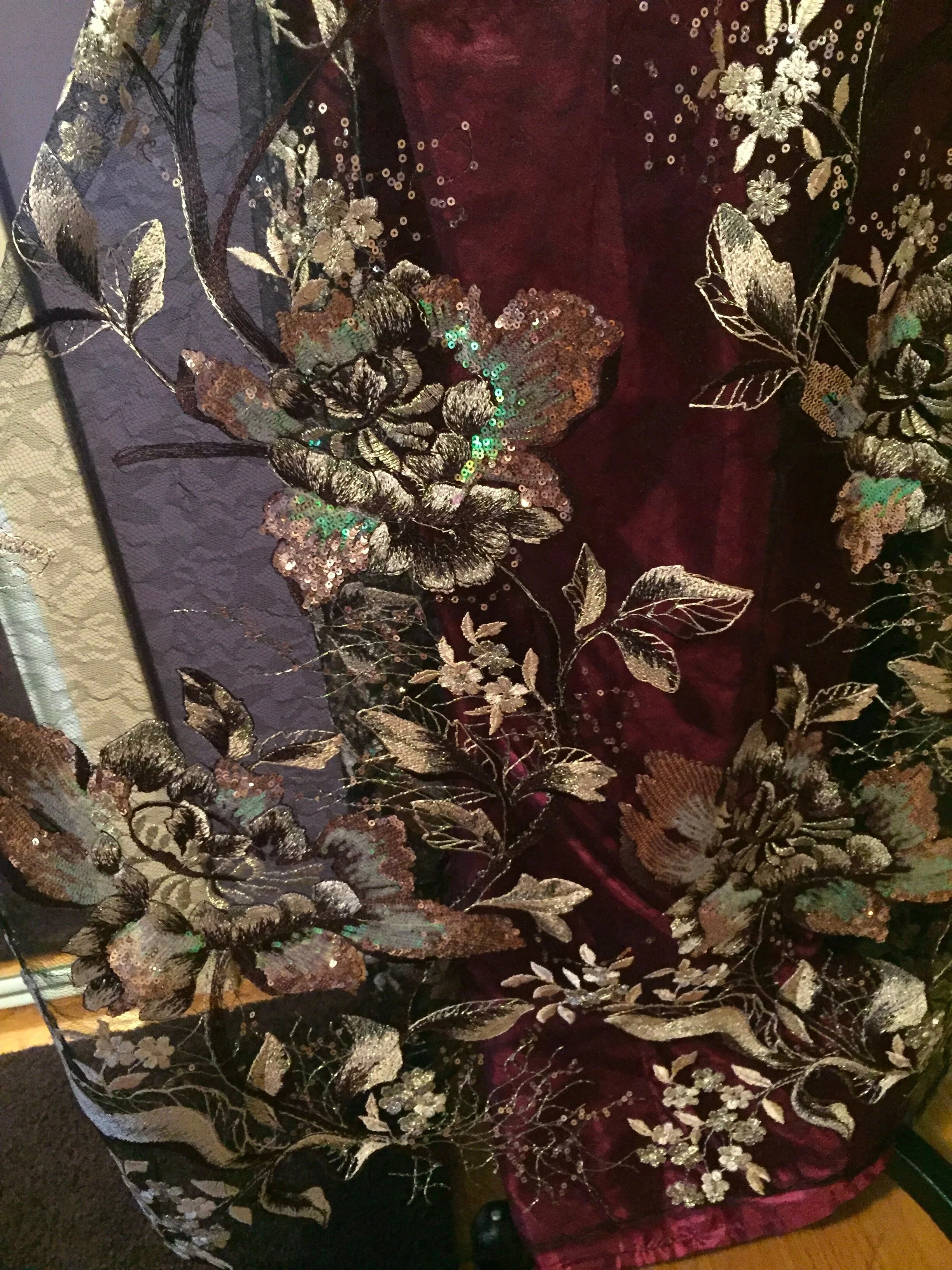 For this costume, the main point of attention is the robe, which acts as a sort of over skirt to the base dress. It’s made out of black lace that I bought at a local fabric store, which has sequined and embroidered flowers, seen below. This fabric actually was what I built the project around; I fell in love with it when I first saw it, and knew I could do something interesting. While the embroidery doesn’t have any red in it, I wanted to compliment the green sequins, so I chose a red underdress, which I’ll write more about later.