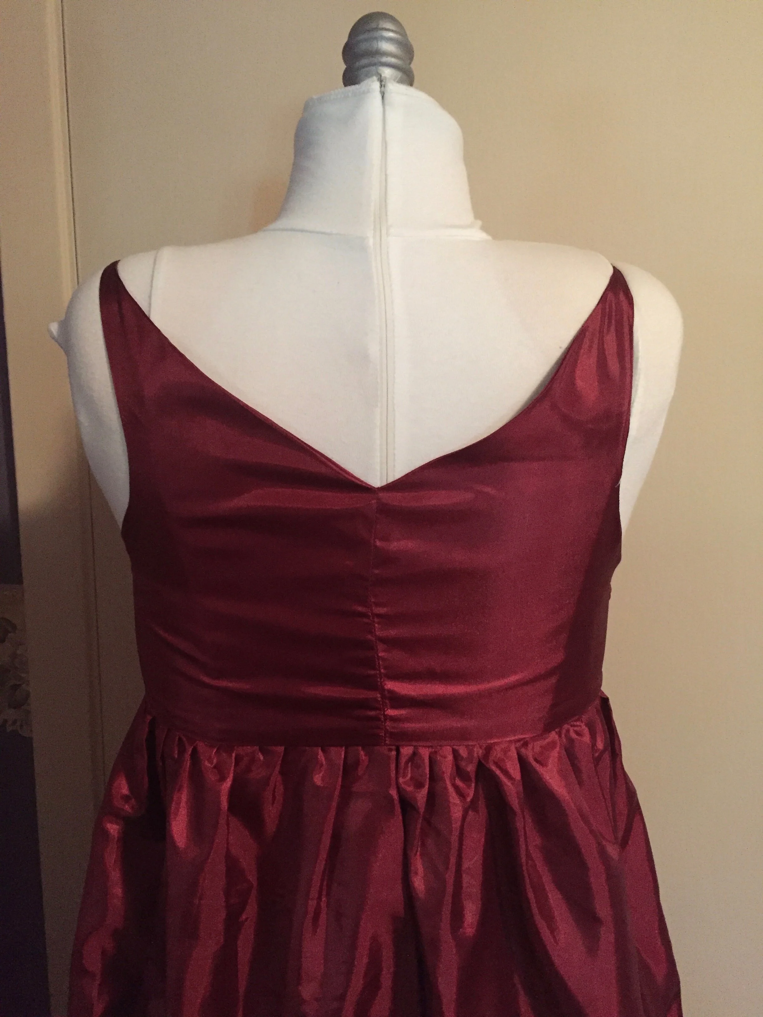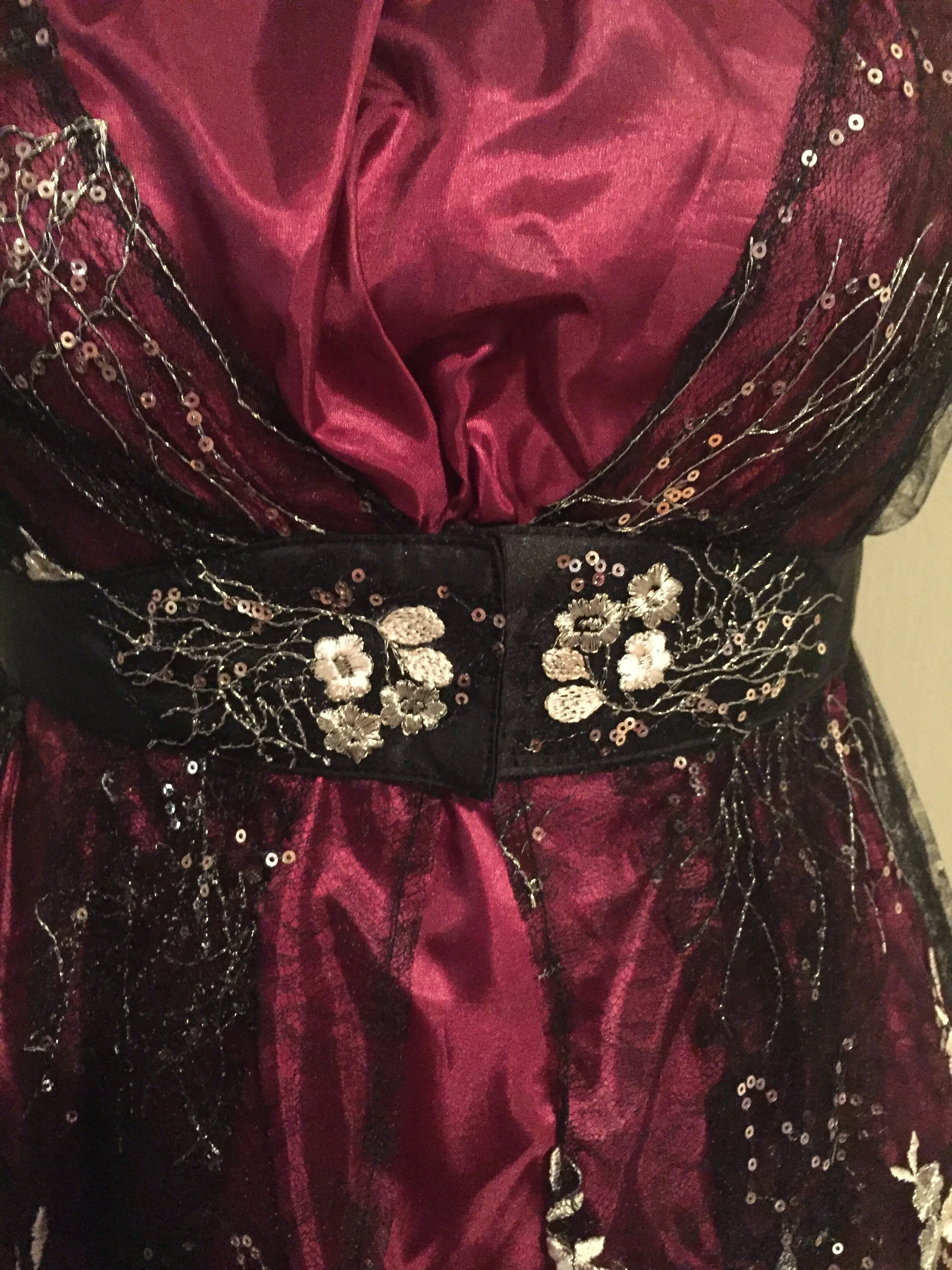 While the robe really catches the eye, the red dress under it is also something I’m pretty proud of. It dips down in a v-shape in the back, and is gathered at the front, which is reminiscent of some 1910s evening gowns I found during my period of research for this costume. The shoulder straps thin out towards the front, making them almost invisible when the robe is put on. It’s fully lined, including the skirt, and while the fabric is admittedly pretty cheap, it was perfectly comfortable to dance in for a few hours.