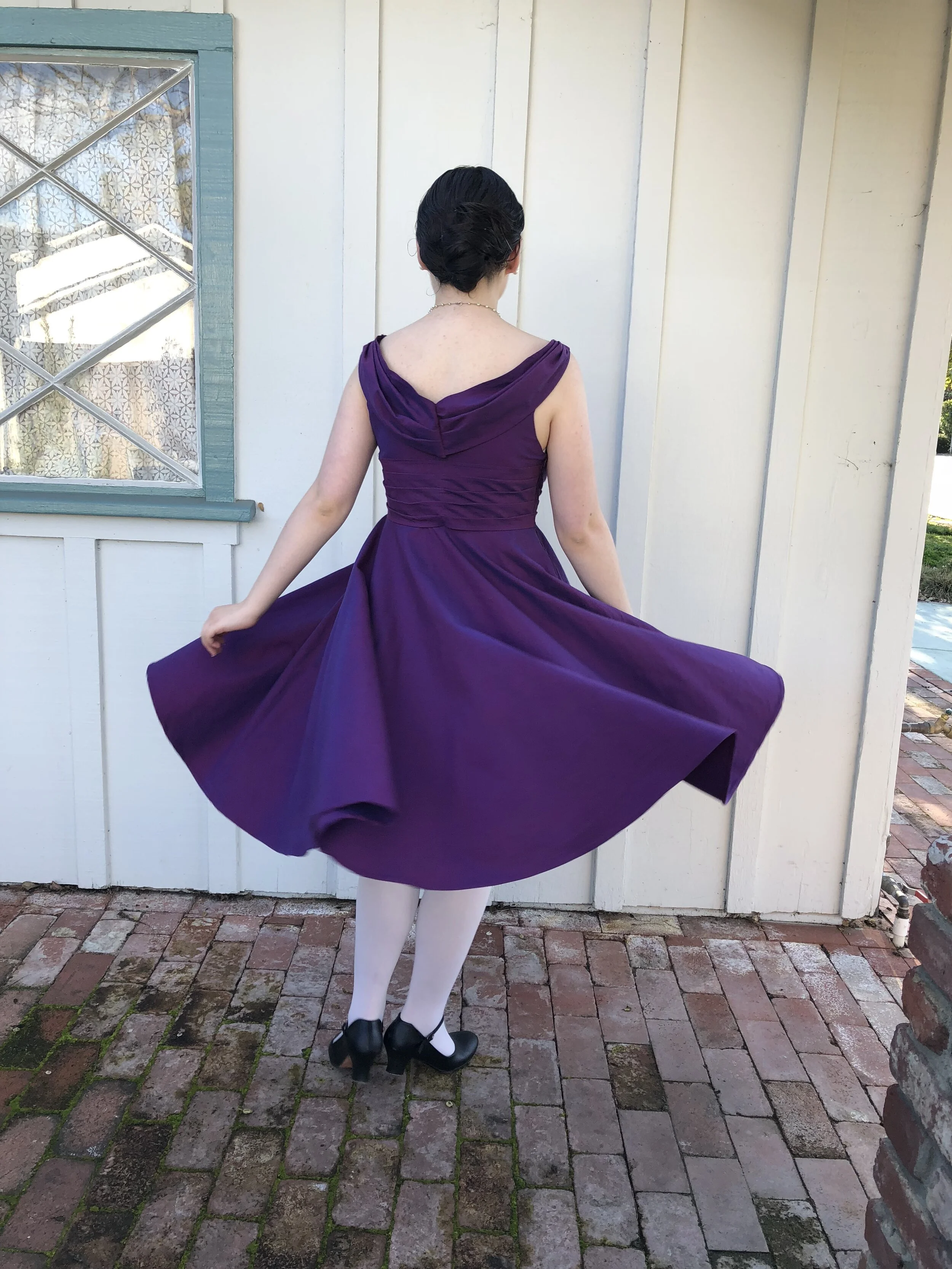 As with many people who have seen Amazon’s The Marvelous Mrs. Maisel, I looked at the titular character’s clothes and thought, ‘I want all of those dresses’. This dress was my attempt at that, and was made in winter 2018. I wore it to a ballroom dance performance, where the full circle skirt was perfect for spins like the one I’m doing in the photo to the left.