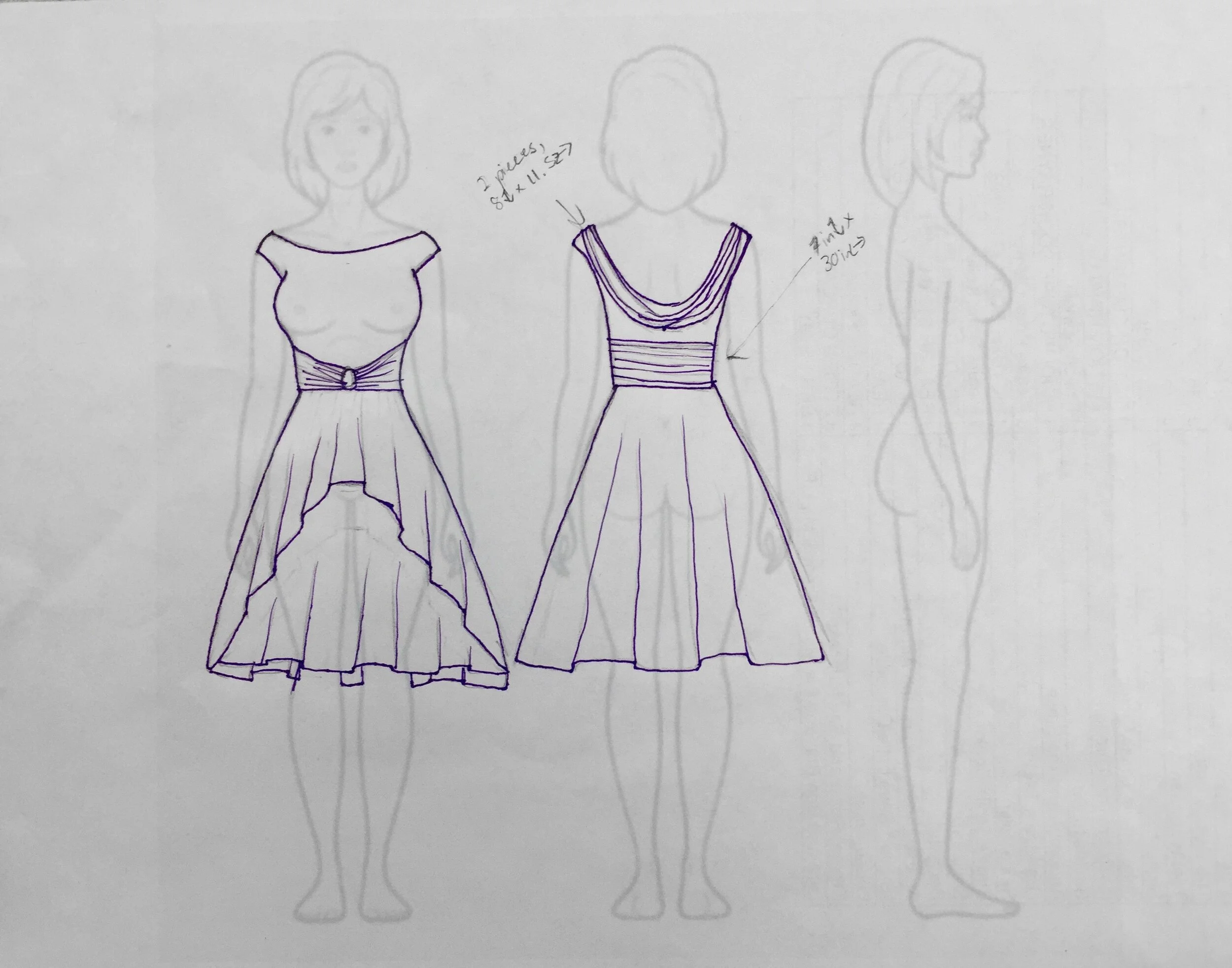 The final sketch did get altered, but not by much; the only difference between it and the dress is that I decided against the overskirt, since I was happy with the dress as it was and didn’t think it would be necessary. The dress ended up being off the shoulder, with a pleated belt and a sash that draped down across the back, as well as a full circle skirt for maximum spin effect.