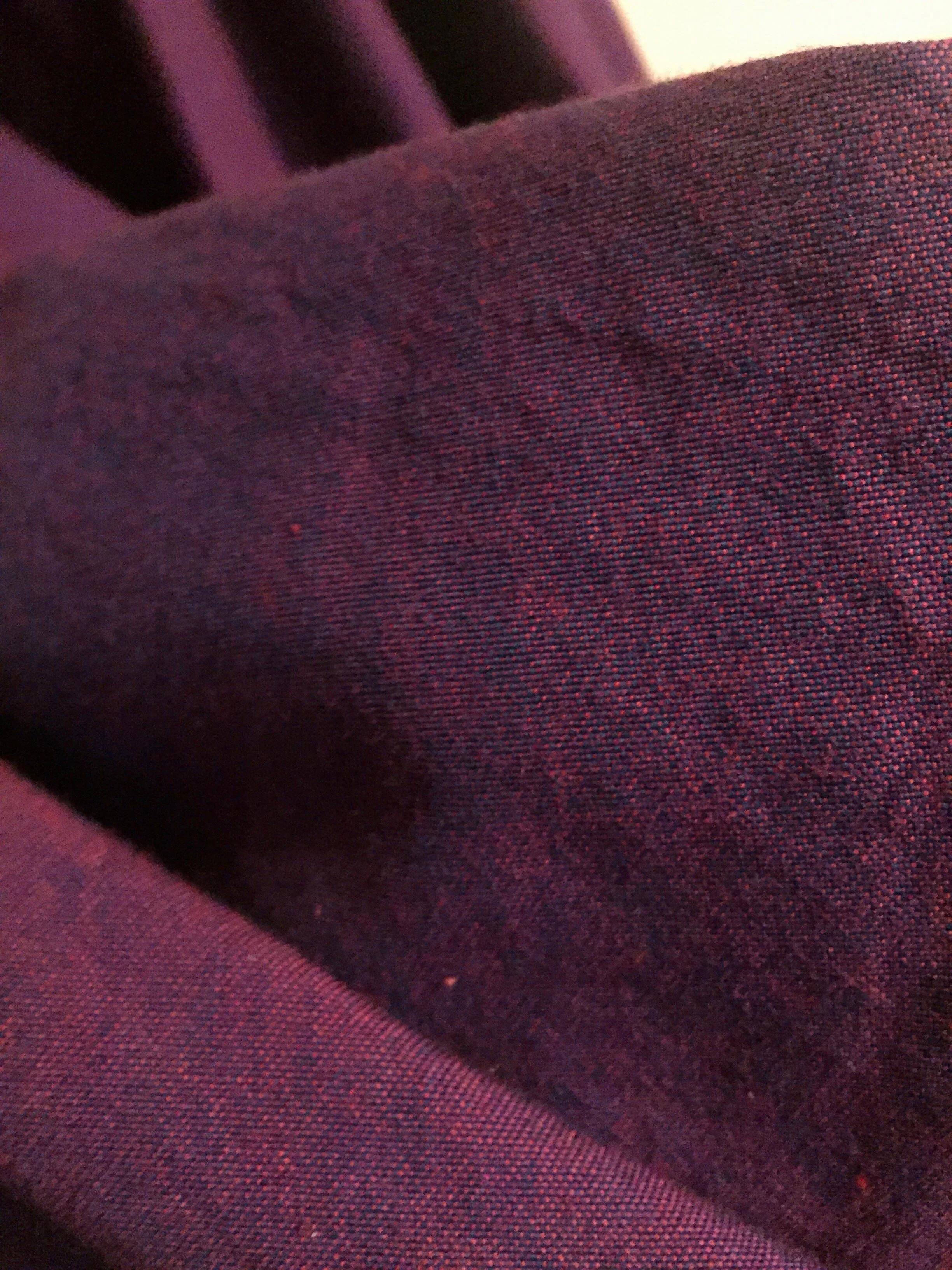 The fabric for this dress is actually really interesting. It’s something called ‘shot cotton’, which means that the threads of the weft and the warp are two different colors. In this case, one is blue and one is red. Far away, the two colors blend together to make it look like normal purple fabric, but when the light hits it, it will catch one of the two colors depending on the angle. This gives it a really beautiful three dimensional effect, in which shadows are a slightly different color than the better lit areas. It’s a tricky effect to get a picture of, so I’ve done my best to show it in these two examples.