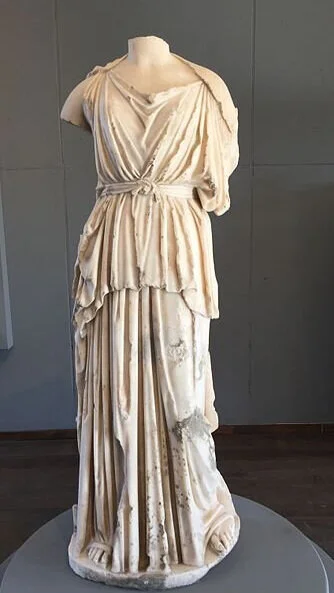 To the right, you can see the first sketch I did of this costume. Despite the fact that the books take place in a roughly Byzantine-parallel time period, I decided to not include any imagery from that, and stuck exclusively to a peplos-inspired design, due to the important symbolism of this costume. The design itself did end up changing from that original sketch; below, you can see three of the statues I ended up using as inspiration for this costume. All three feature a layered peplos with a belt at the waist, which is the style I decided to go for, since it offered me a lot of places to put embroidery.