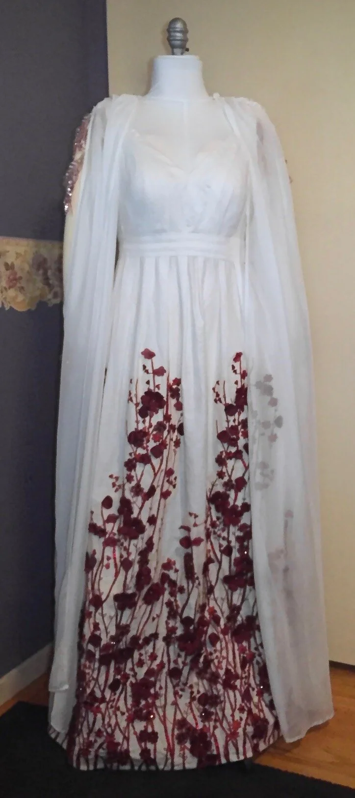 The dress itself is very loosely inspired by the shape of the garments worn by Franklin Simmons’ Penelope (1896) and Antonio Canova’s Dancer (1811-1812), though it’s definitely not historically accurate. I wanted there to be a feeling of the wearer being shrouded in mist, so I made a cloak out of thin, sheer white fabric. The red lace is positioned to look both like flowers growing up the dress and blood seeping up from the hem to show the life and death contrast that comes along with Persephone and her place in the Greek pantheon.