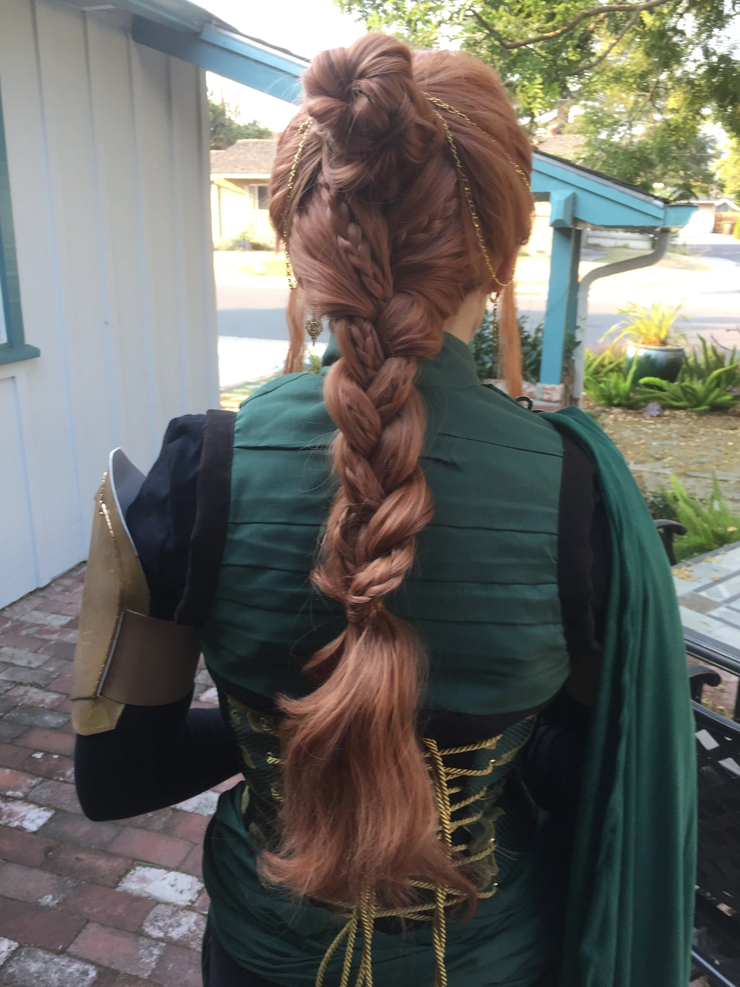 The makeup for this costume is pretty simple; I went for a very natural look, but added small freckles across my face, to fit with the artist’s depiction of the character. I also wore a red wig, which was braided back, and had gold chains pinned in to reflect the details in the rest of the costume.